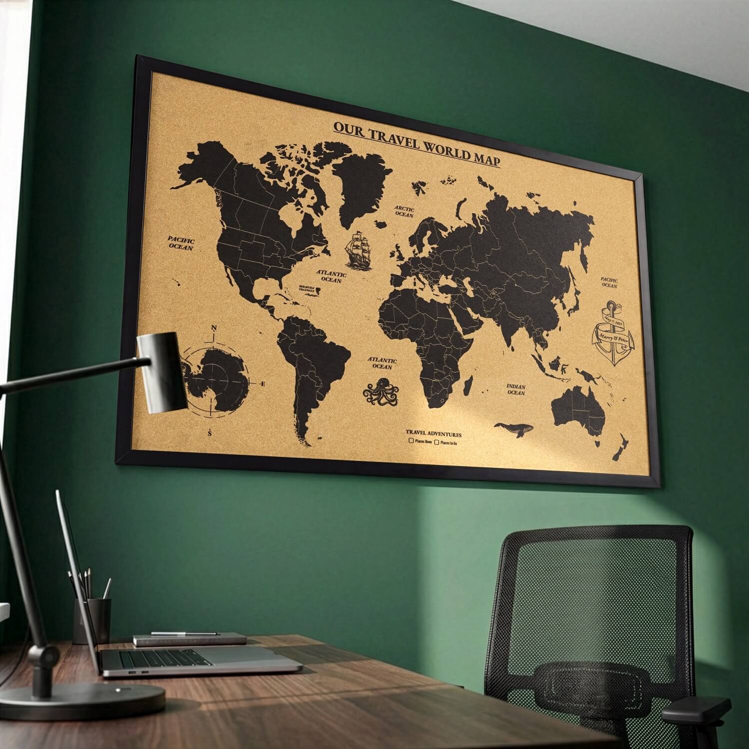 Mantar Dünya haritası, sağ kısmında yer alan çapa tasarımına ekleyeceğiniz isim ve tarihler ile size özel bir duvar tablosuna sahip olabilirsiniz. Mantar üzerine kaliteli UV baskısı, çerçeveli yapısı ve estetik tasarımıyla dikkat çeken harita özgün bir duvar dekorudur.