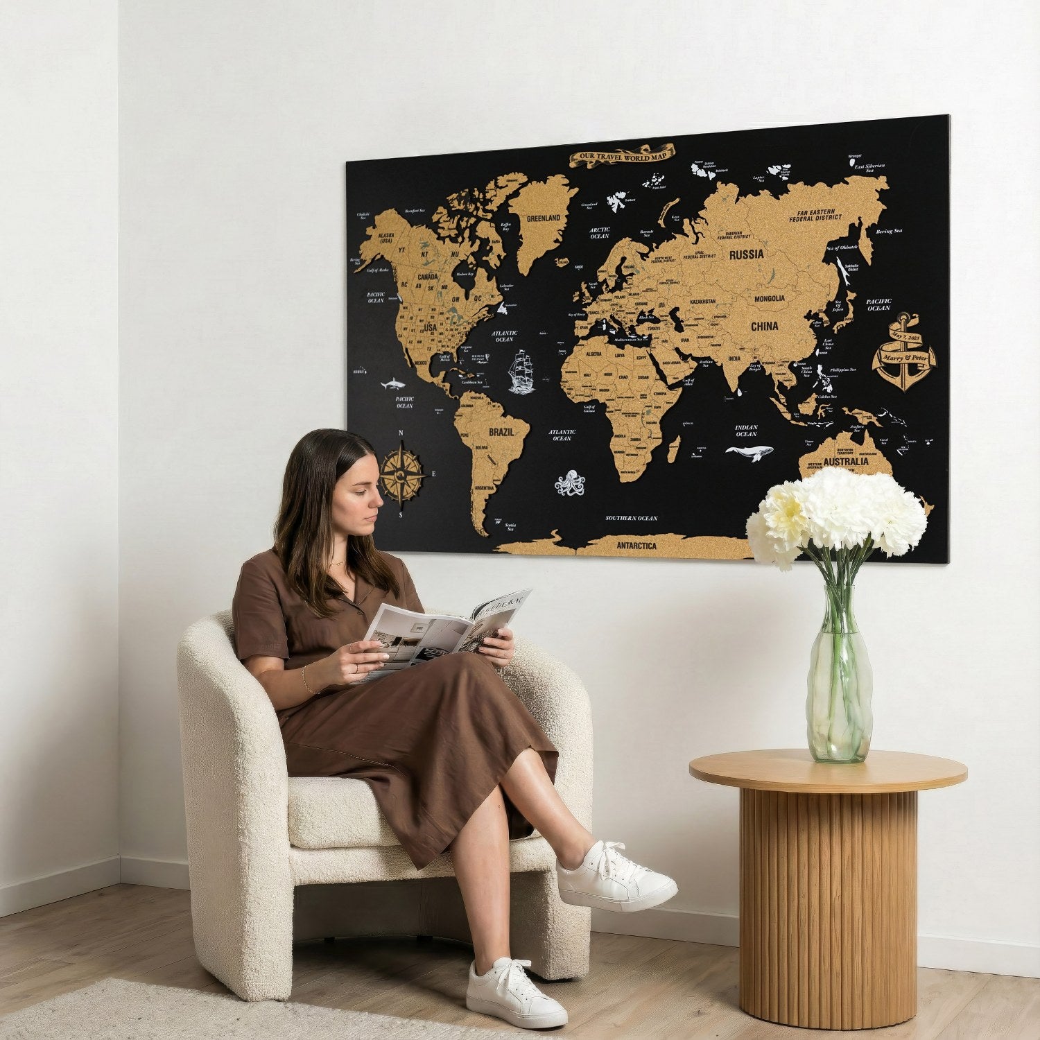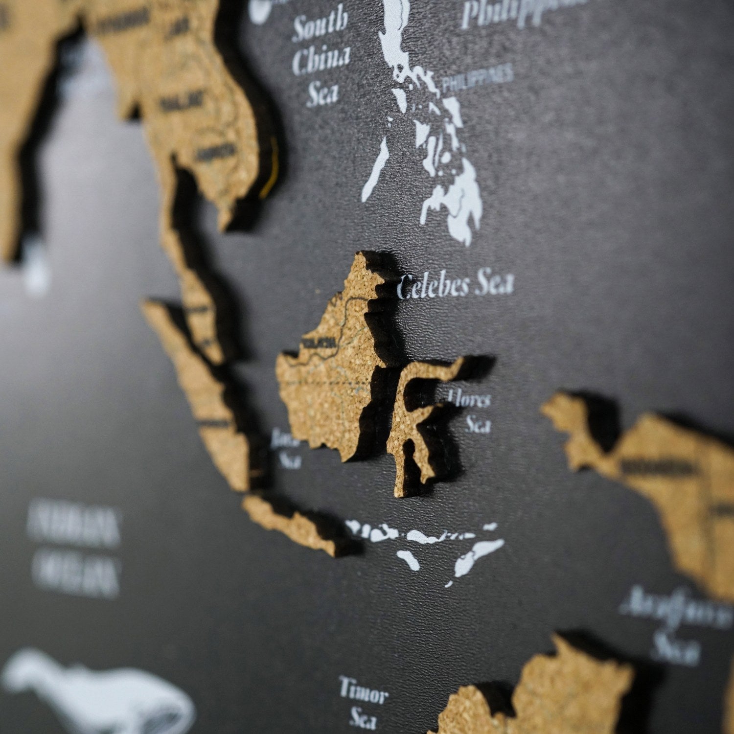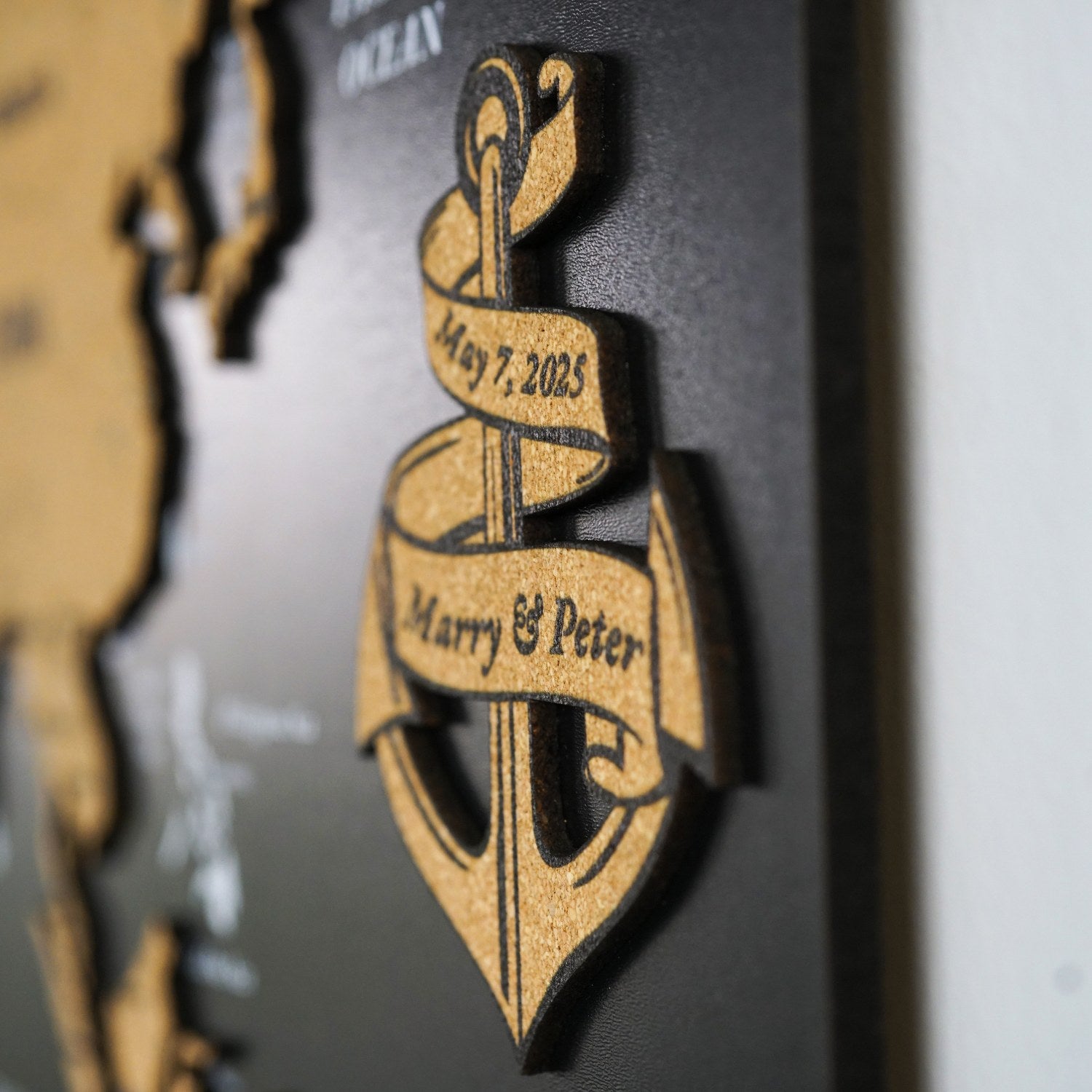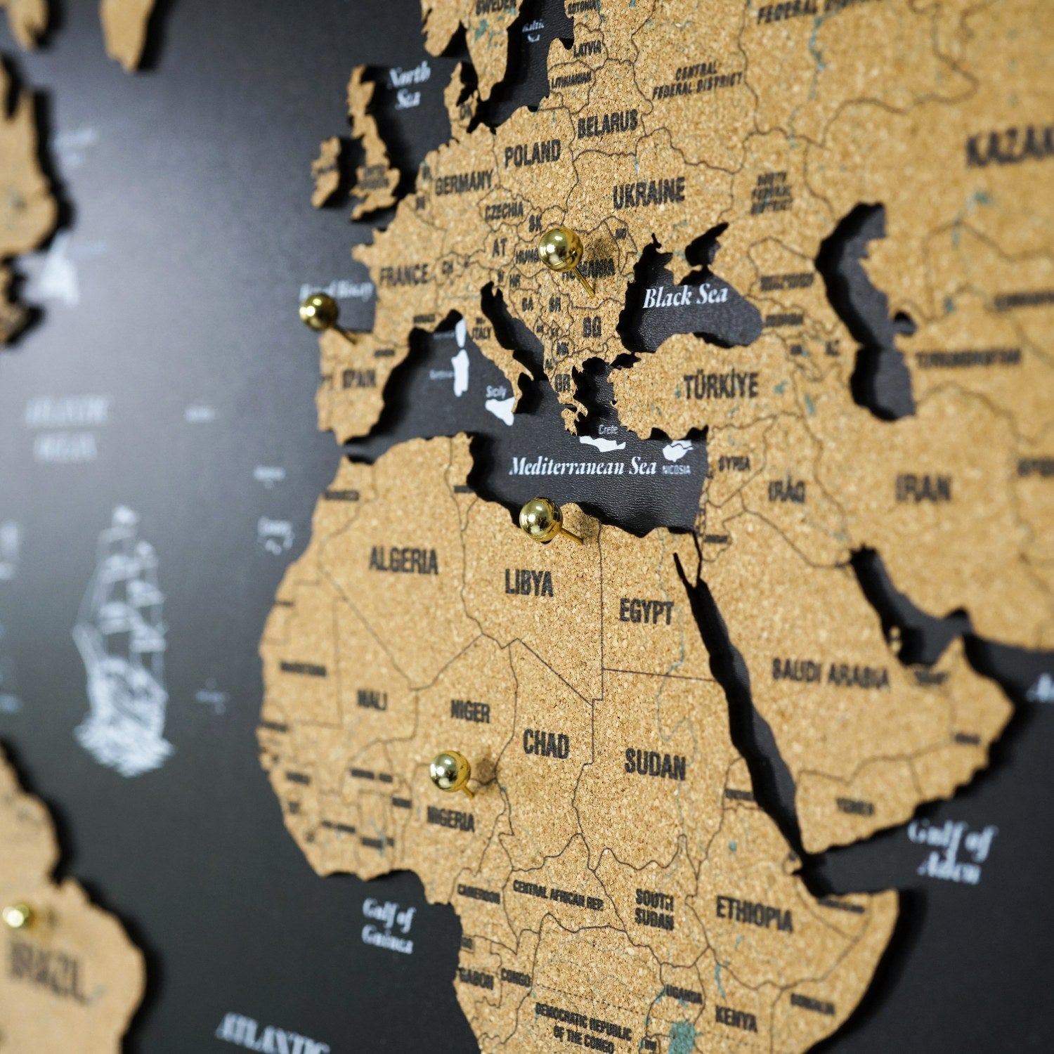 Mantar pano ahşap dünya haritası, şık ve modern tasarımıyla, evinize veya ofisinize benzersiz dokunuş katacak. Siyah zemin üzerine yerleştirilen mantar dünya haritası, kaliteli UV baskısı ve özgün tasarımıyla dikkat çeker. Bu modern duvar haritası evinizde anlamlı ve estetik bir ahşap tablo setine sahip olmanızı sağlar.